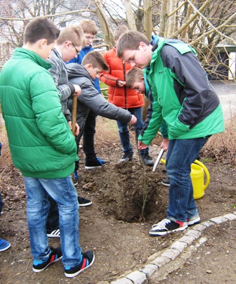 Alle Baumsetzlinge konnten am 12. April 2013 mit Unterstützung des Hausmeisters gepflanzt werden. Zwei Holzapfel-Bäume sowie eine Wildkirsche fanden ihren Platz auf dem Schulgelände. Mit Spaten, Heckenscheren und Gießkannen ausgerüstet, machten sich die Schülerinnen und Schüler voller Eifer an die Pflanzaktion. Schon nach kurzer Zeit waren die Bäumchen gepflanzt. Des Weiteren wurden Baumpaten ernannt, die sich in der nächsten Zeit um die Setzlinge kümmern, denn die Hege und Pflege gehört ebenfalls zu diesem Projekt.