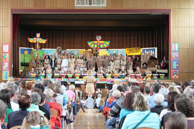 Höhepunkt der Festlichkeiten war dann das Mitmach-Musical „Wakatanka“ in der voll besetzten Turn- und Festhalle unter der Leitung von Regina Schmidt-Auginski und Lucie Gundel. Die jungen Künstler aus der Grundschule entführten mit technischer Unterstützung der 6. Klasse abermals in den Wilden Westen und begeisterten mit Trommeln, Bläserklasse, Orff, Chor und Flöten, den Solisten und einem Squaredance vor wundervoll dekorierten Kulissen.