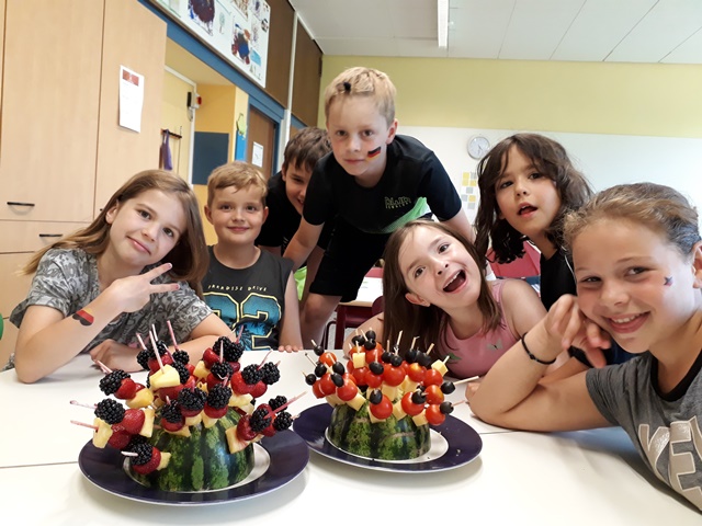 Und bei der Kreativwerkstatt blieben wir wieder beim Thema Fußball und es entstanden aus Melonen und Fruchtspießen lustige Kreationen, in den Farben schwarz-rot-gold.