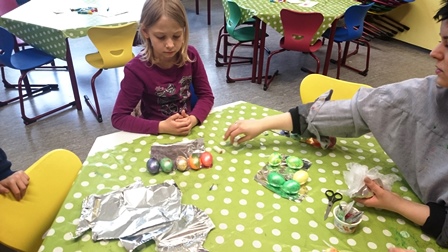 Bei der letzten Mittwochsaktion vor Ostern durften die Kinder passend zur Jahreszeit Ostereier färben.