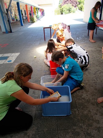 Dabei erhält man einen Faserbrei, die sogenannte „Pulpe“. Dann gibt man nochmal Wasser hinzu. Anschließend kann das Papierschöpfen mit einem bespannten Rahmen losgehen. Die Kinder haben auf diese Weise ihr eigenes Papier hergestellt und teilweise noch mit Blumen und Servietten verziert.