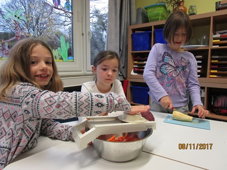 Im Rahmen der „Koch- und Backgruppe“ stellten die Kinder gemeinsam mit Frau Flaig und den Sozialschülerinnen Gemüsepommes her. Das Gemüse wurde im zuerst sorgfältig geschält, bevor es dann geschnitten und im Ofen knusprig gebacken wurde. Mit ein wenig Öl und Salz schmeckt der selbstgemachte Snack super lecker.