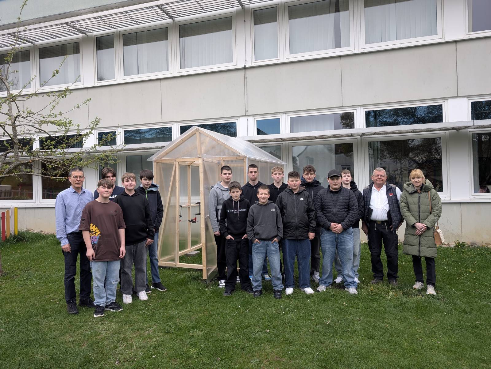Tatkräftige Unterstützung erhielt die Gruppe sowohl vom Hausmeister Elmar Roth, der mit Tipps oder Werkzeug aushalf sowie von einigen Zehntklässlern, die beim Transport des Gewächshauses halfen.