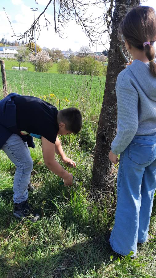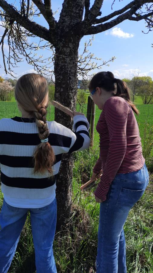 Im Spielegarten von Emilia Suhm erwarteten die Schülerinnen und Schüler drei Stationen, die sie abwechselnd durchliefen: Interessante Informationen über den Anbau von Äpfeln und über Apfelbäume, Wissenswertes über den Baumschnitt und Rindenpflege sowie die Herstellung von Futterstellen für Insekten und Vögel. Unterstützt wurde Emilia Suhm dabei von den Mitgliedern der Villingendorfer Umweltschutzgruppe Josef Burri und Bernhard Belser.