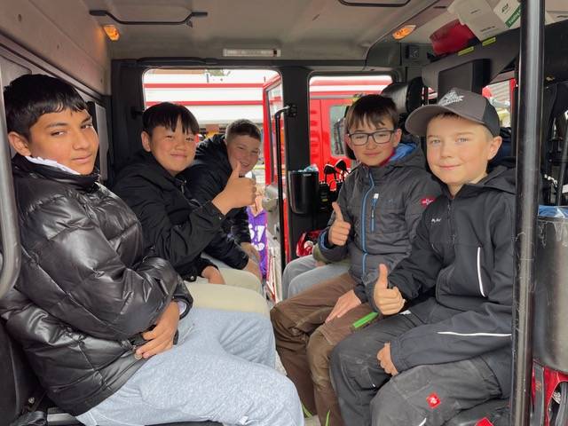 Im Feuerwehrhaus erwartete uns eine spannende und informative Präsentation. Wir erhielten einen Einblick in die Aufgaben der Feuerwehr und lernten das Verbrennungsdreieck sowie die Bedeutung von Rauchmeldern kennen. Außerdem wurde anschaulich erklärt, worin der Unterschied zwischen einem Notfall, einem Unglück und einer Katastrophe besteht und welche weiteren Hilfsorganisationen es gibt.