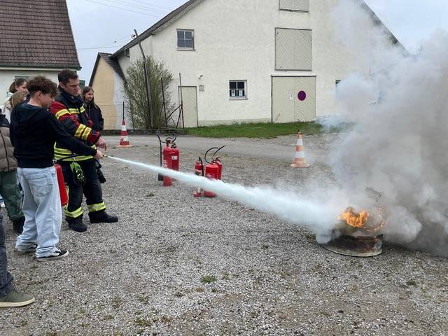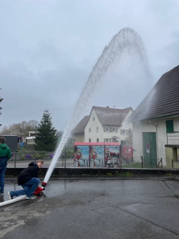 Ein besonderes Highlight wartete am Ende des Besuchs: Die Schülerinnen und Schüler durften selbst aktiv werden. In vier Gruppen aufgeteilt, durchliefen sie verschiedene Stationen. Dabei wurde ein Löschfahrzeug vorgestellt, die Kinder konnten mit Löschschläuchen Wasser spritzen, echte Feuerwehrausrüstung anprobieren und sogar das Löschen eines Feuers mit einem Feuerlöscher üben. Diese praktischen Erfahrungen machten den Aktionstag zu einem unvergesslichen Erlebnis.