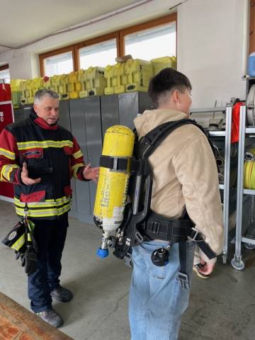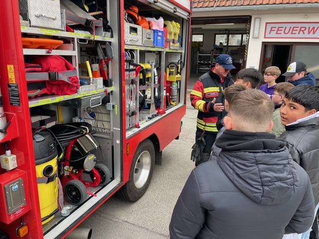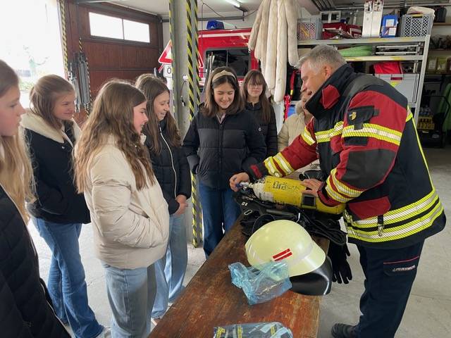 Im Feuerwehrhaus erwartete uns eine spannende und informative Präsentation. Wir erhielten einen Einblick in die Aufgaben der Feuerwehr und lernten das Verbrennungsdreieck sowie die Bedeutung von Rauchmeldern kennen. Außerdem wurde anschaulich erklärt, worin der Unterschied zwischen einem Notfall, einem Unglück und einer Katastrophe besteht und welche weiteren Hilfsorganisationen es gibt.
