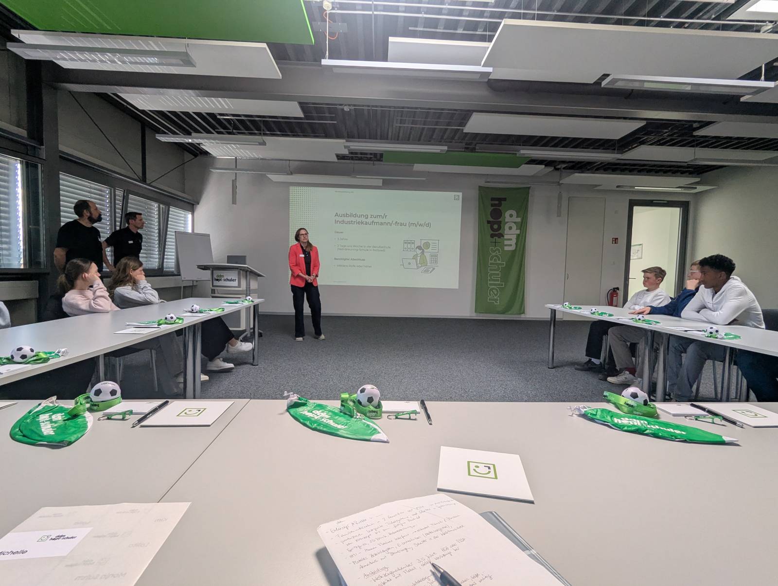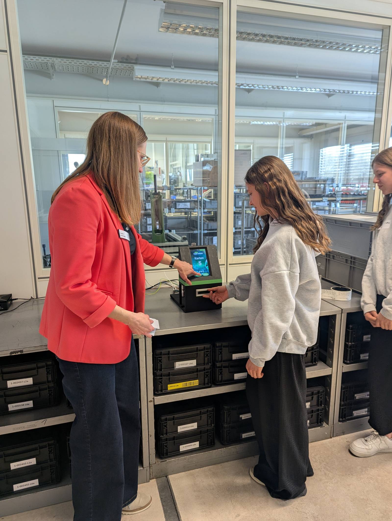 Um einen konkreten Einblick in die Entwicklung und Herstellung dieser Teile zu erhalten, ging es anschließend mit dem Rundgang durch die Firma los. Dabei wurden vor allem die drei Ausbildungsberufe des Industriekaufmannes/-frau, des Technischen Produktdesigners und des Werkzeugmechanikers genauer thematisiert. Dazu wurden die Schülerinnen und Schüler durch alle Abteilungen im kaufmännischen Bereich aber auch im technischen Bereich geführt. Viele spannende Einblicke konnten dabei gemacht werden, wie z.B. die Herstellung einer Leiterplatte, das Entwickeln und designen eines Schiebepuzzles am Computer, die Herstellung von Teilen im 3D-Drucker, das Fräsen eines Werkstücks u.v.m. Im Lager durften die Jugendlichen dann ihre Teile in den Hochregalen suchen und holen, die sie später für das Zusammenbauen des Schiebepuzzles benötigt haben.