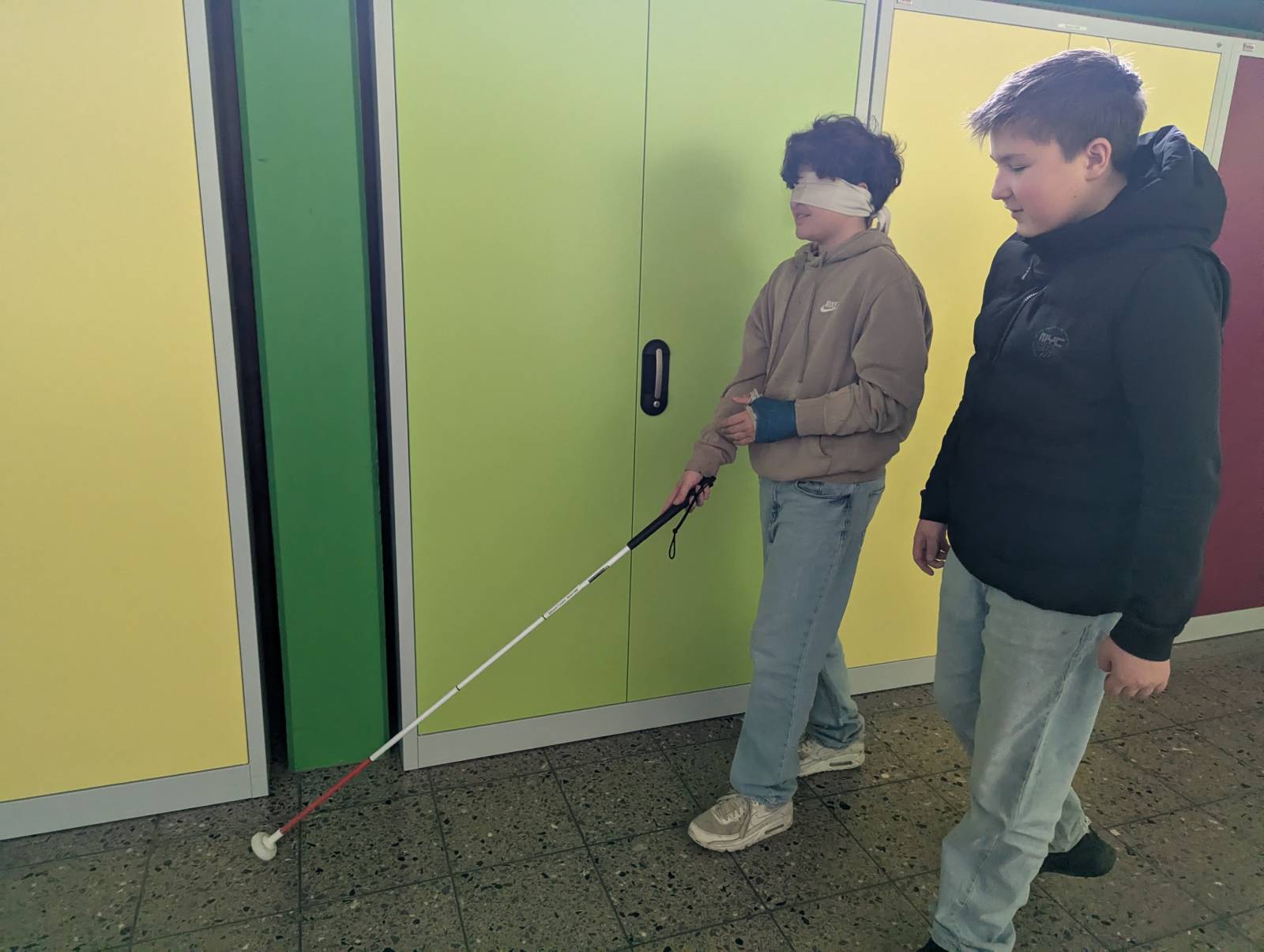 Besonders eindrucksvoll war neben der Vorstellung der verschiedenen Ausbildungsberufe der praktische Teil des Besuchs. In fingierten Alltagssituationen konnten die Jugendlichen selbst erfahren, wie es sich anfühlt, wenn bestimmte Fähigkeiten plötzlich nicht mehr zur Verfügung stehen. Mit Augenbinde und Blindenstock ausgestattet, erkundeten sie das Schulhaus ohne ihr Augenlicht. Schnell wurde deutlich, wie sehr wir im Alltag auf unsere Sehkraft angewiesen sind: Gewohnte Wege wirkten unsicher, Geräusche erschienen intensiver und selbst kleine Hindernisse stellten eine Herausforderung dar. Diese Selbsterfahrung sorgte für nachdenkliche Momente und förderte das Verständnis für Menschen mit Sehbeeinträchtigungen. Auch Eindrücke in den Lebensalltag eines demenzkranken Menschen wurden durch verschiedene Stationen näher gebracht.