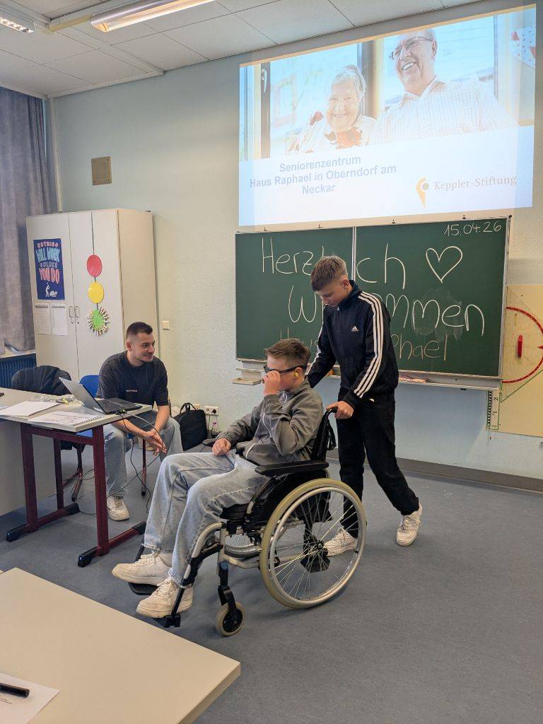 Am Mittwoch, den 15.04.2026, erhielt die Klassenstufe 8 Besuch vom Seniorenzentrum Haus Raphael in Oberndorf am Neckar. Gabriel Stier, Auszubildender im dritten Lehrjahr, und Sabrina Stegmaier, Praxisanleitung, gaben dabei einen Einblick in die abwechslungsreichen Tätigkeitsfelder der Pflege und des Gesundheitswesens.
