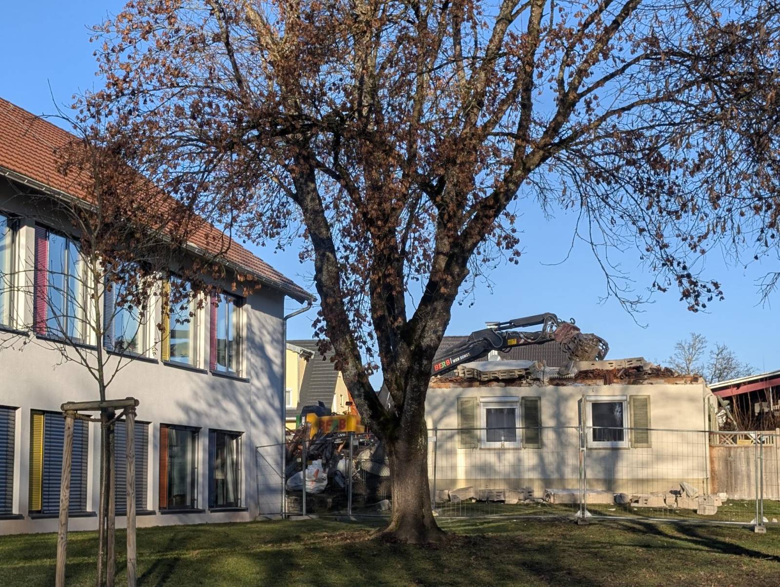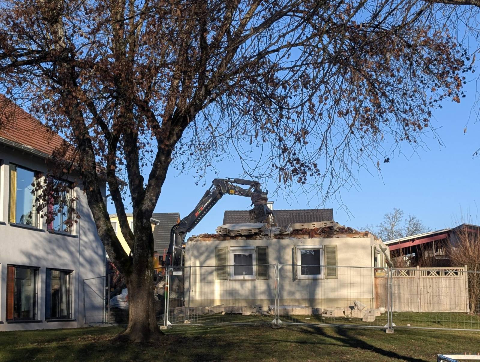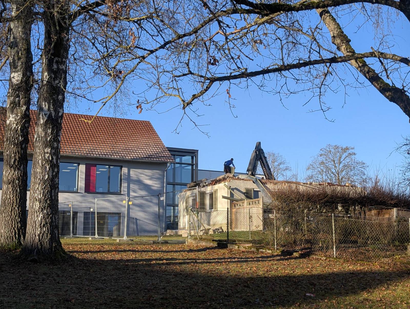 Nachdem die Garage abgerissen und das Dach abgedeckt waren, ging es mit den Maßnahmen auch schon weiter. Mit Staunen verfolgten die Kinder aus den Klassenzimmern, wie schnell der gesamte Dachstuhl des Gebäudes entfernt wurde. Dem folgte auch gleich das Abreißen der ersten Mauern des Hauptgebäudes.