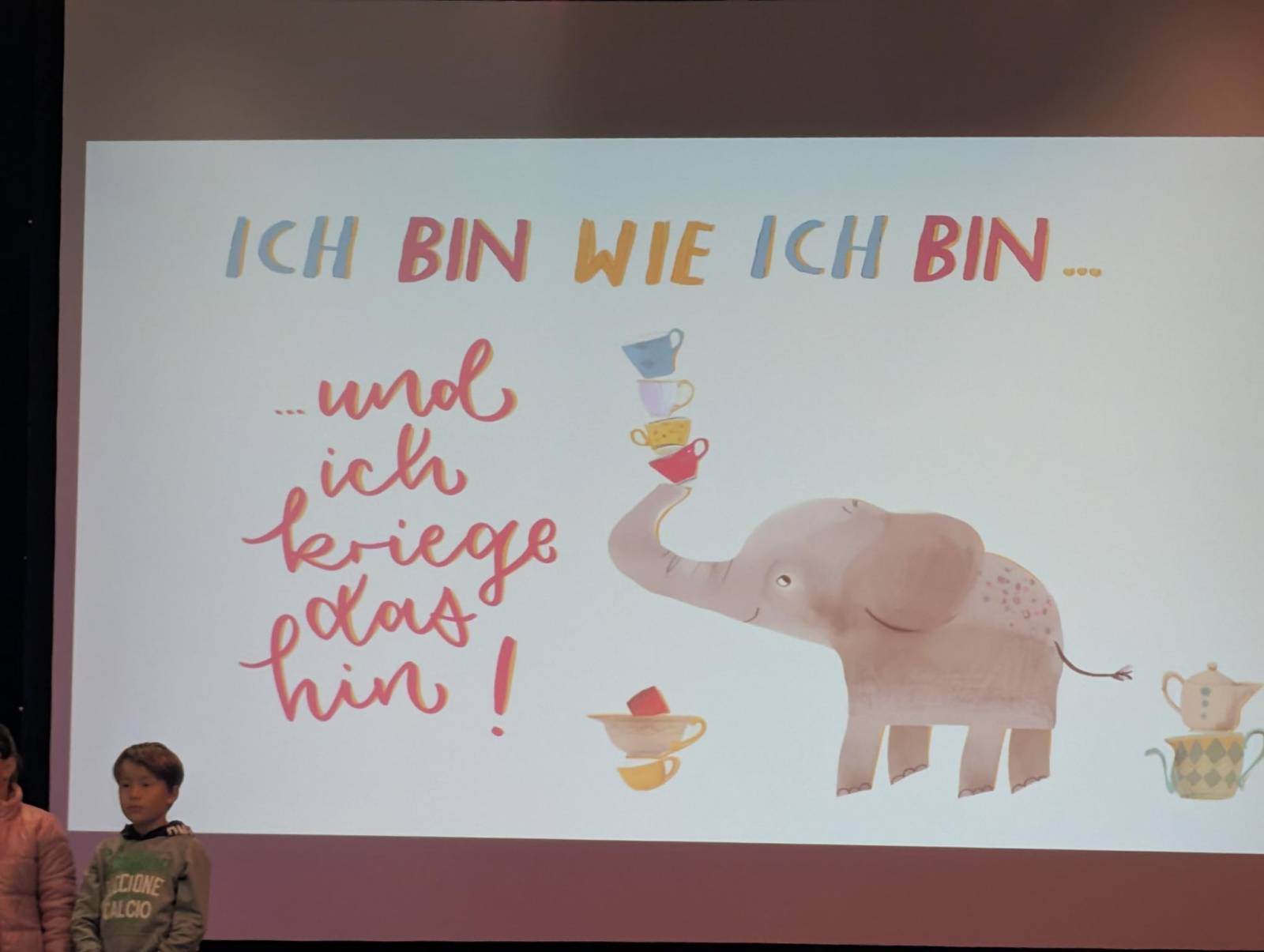 Die Moderatorinnen Ann-Kathrin Scharnetzki und Celia Kopf, die durch das Programm führten, baten auch sogleich die zweiten Klassen auf die Bühne, die mit dem Lied „Das schaffst du!“ für gute Stimmung sorgten.