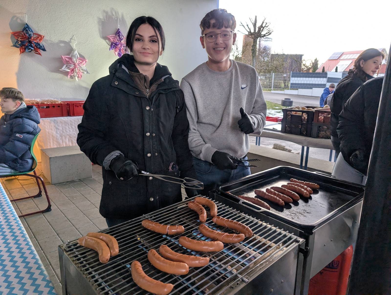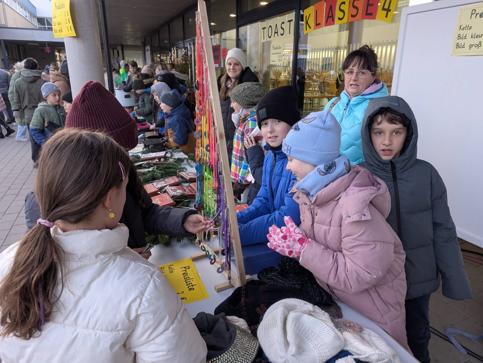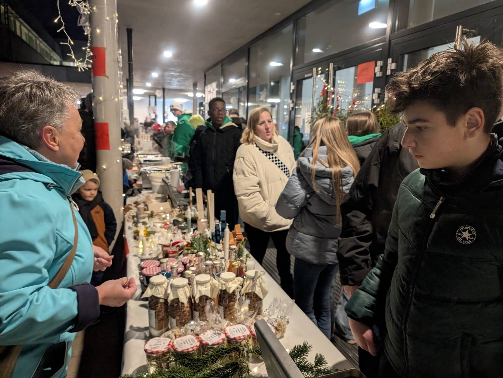 Alle Klassenstufen von 1 bis 10, der Elternbeirat sowie der Schulförderverein beteiligten sich mit Angeboten. Bei leckerer Grillwurst im Wecken, Pommes Frites, Schinken-Käse-Toasts, Hotdogs, Waffeln und Crêpes sowie Glühwein und Punsch wurde in gemütlicher Atmosphäre auf die bevorstehende Adventszeit eingestimmt. Passend dazu konnten tolle Produkte, die in den Klassen entstanden sind, erworben werden. Weihnachtsanhänger aus Salzteig, Sterne aus Papiertüten, Bienenwachskerzen, verschiedene Anhänger, Windlichter, Weihnachtsdekoration, Backmischungen, Bruchschokolade, leckere Marmeladen und vieles mehr wurde von den Schülerinnen und Schülern angeboten. Darüber hinaus bot der Ganztag weihnachtliches Basteln an, die Klassen 10 Kinderschminken und die SMV Glitzertattoos an.
