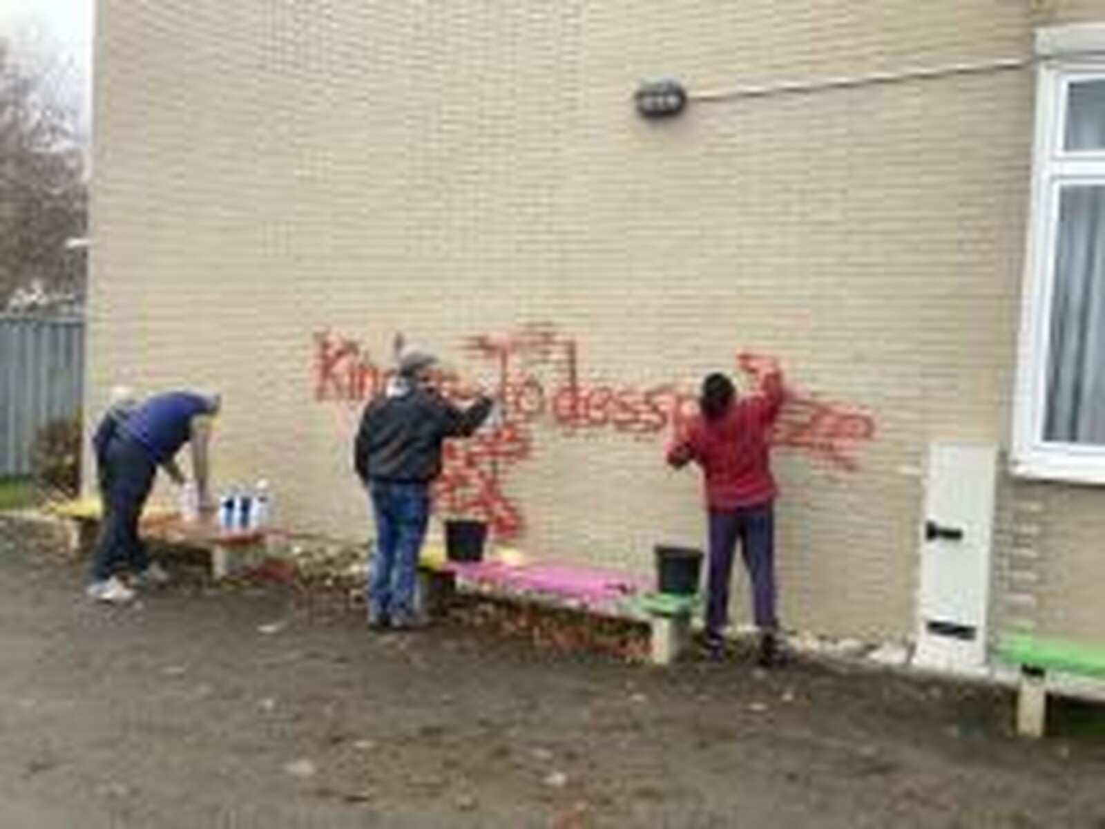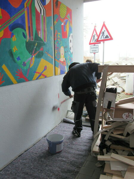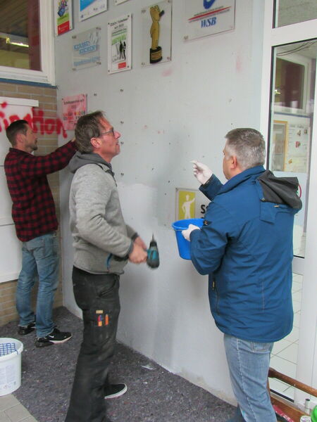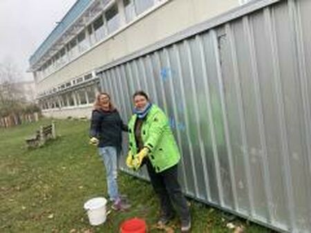 Der Elternbeiratsvorsitzende Jan C. Rolli hatte zu einer Reinigungsaktion der zahlreichen Schmierereien, die vermutlich von Impfgegnern im Vorfeld einer Impfaktion in den Räumlichkeiten der Schule gemacht wurden, aufgerufen. Auch Bürgermeister Marcus Türk oder die ehemalige Schülerin und Landespreisträgerin Laura Pietruszka ließen sich nicht nehmen, mit Hand an zu legen.