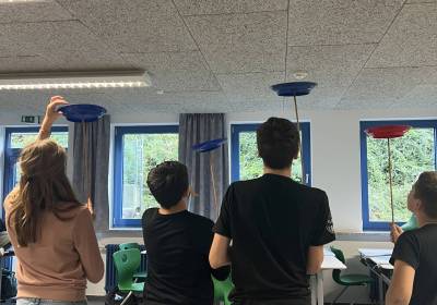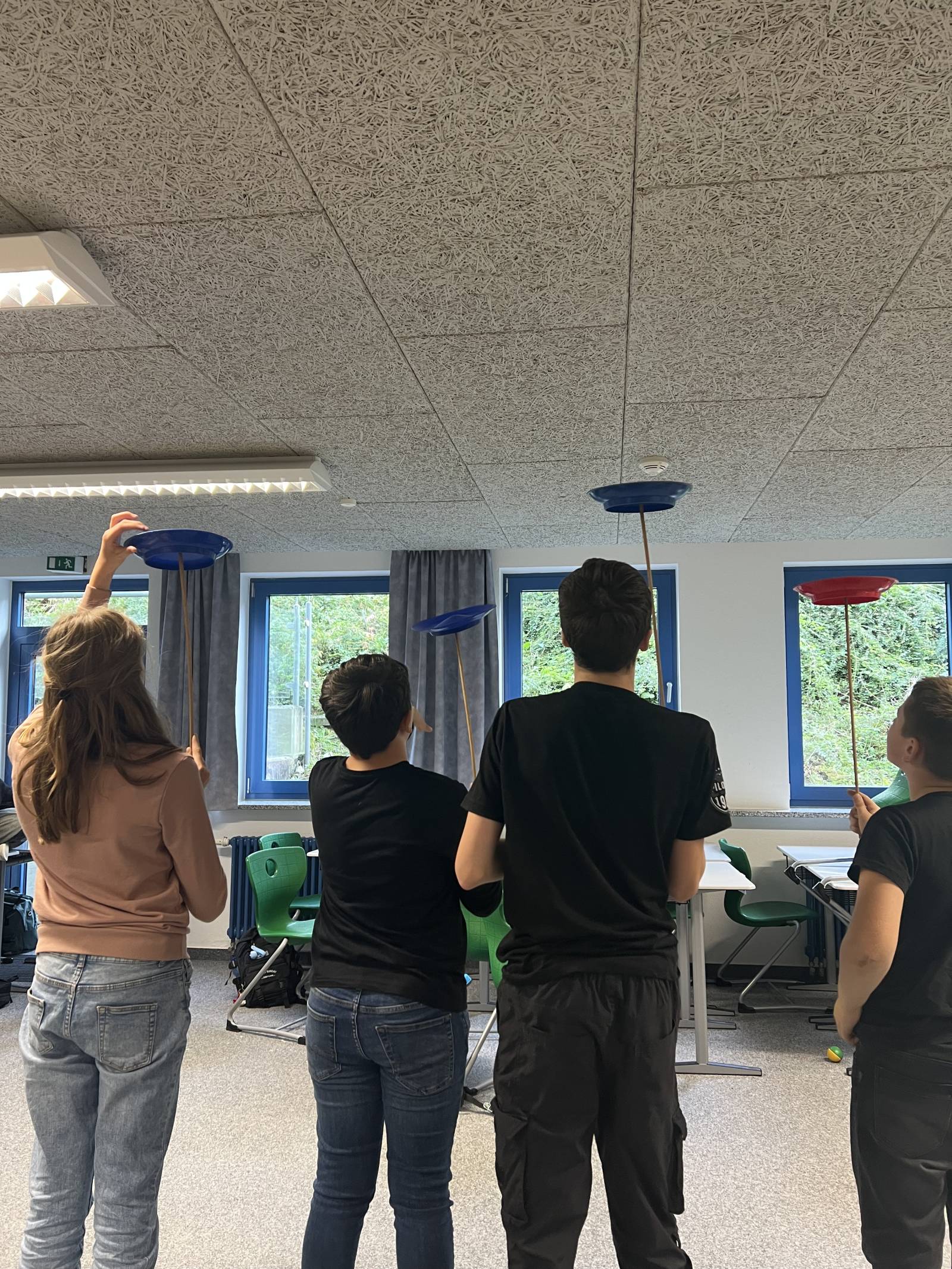 Beim Zirkus lernen die Schülerinnen und Schüler, wie man jonglieren kann, Teller drehen oder sie probieren sich in akrobatische Darbietungen aus.