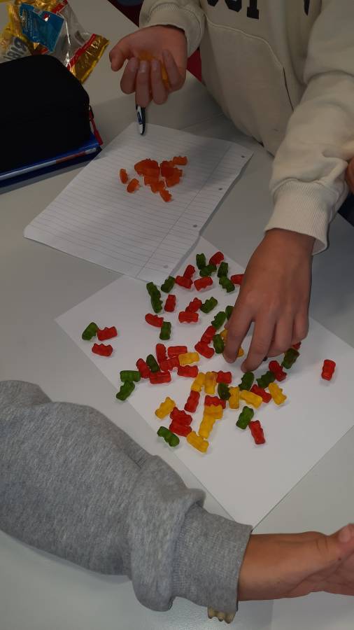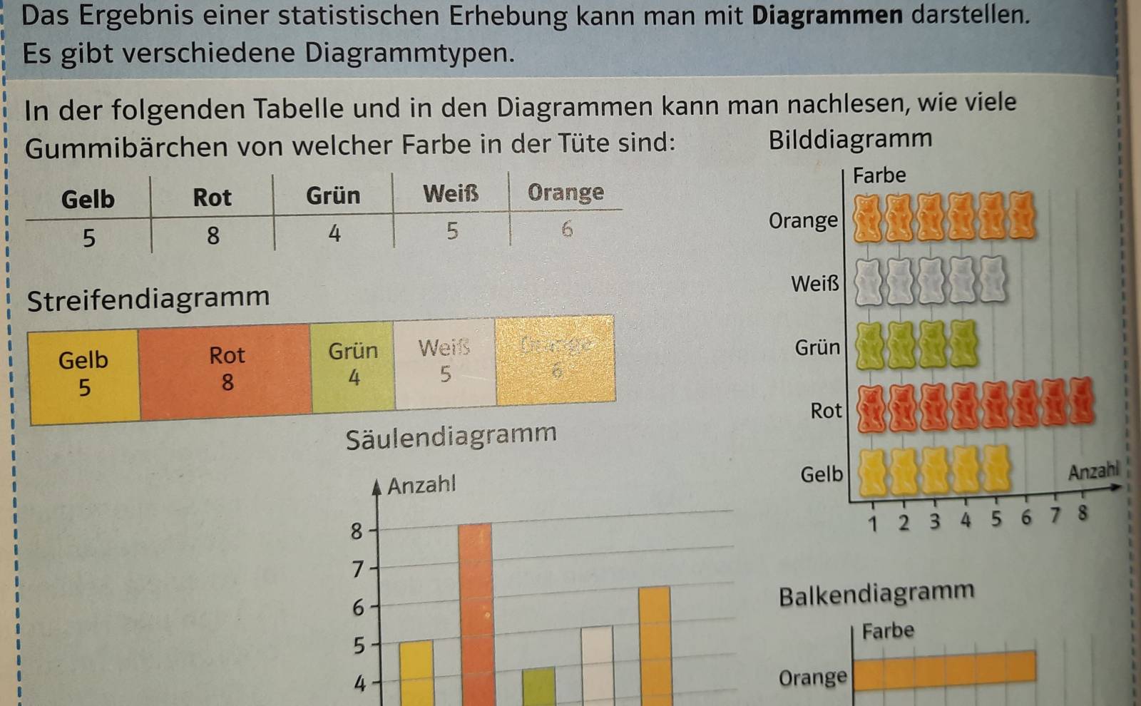 Vorweg wurden mithilfe von Gummibärchen Daten erhoben, die anschließend in Tabellen und als Diagramme dokumentiert wurden.