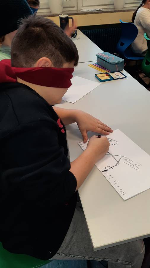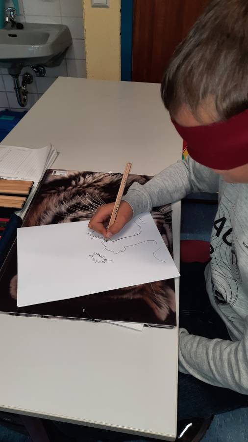 Innerhalb des Themas "Experimentelles Zeichnen" durften die Schülerinnen und Schüler der fünften Klassen verschiedene Techniken ausprobieren. Nach dem gegenseitigen Portraitieren mit der "falschen" Hand wurden verschiedene Motive blind gezeichnet.