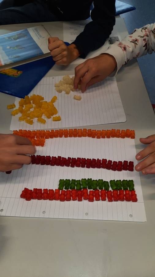 Vorweg wurden mithilfe von Gummibärchen Daten erhoben, die anschließend in Tabellen und als Diagramme dokumentiert wurden.