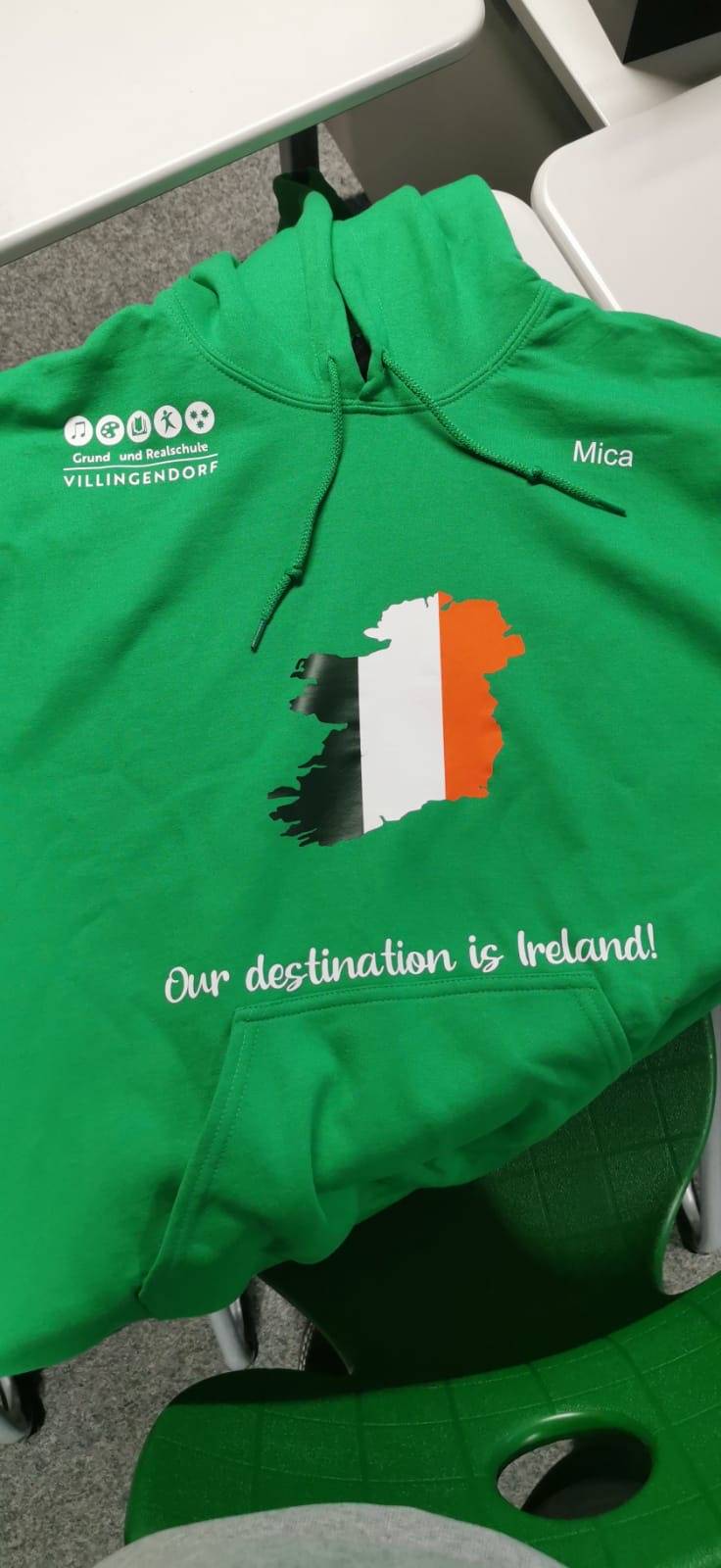 Im Kunstunterricht fertigten alle einen eigenen Designvorschlag für das Irlandoutfit an: Welcher Spruch soll das Leitmotiv der diesjährigen Irlandklasse sein? Soll die Schrift schnörkelig sein? In welcher Form soll die Irlandflagge auf dem Outfit repräsentiert werden? Welche Farbe sollen der aufgedruckte Name, der Spruch und das Schullogo haben? Anschließend wurde abgestimmt und somit stand das Design des diesjährigen Irlandoutfits fest.