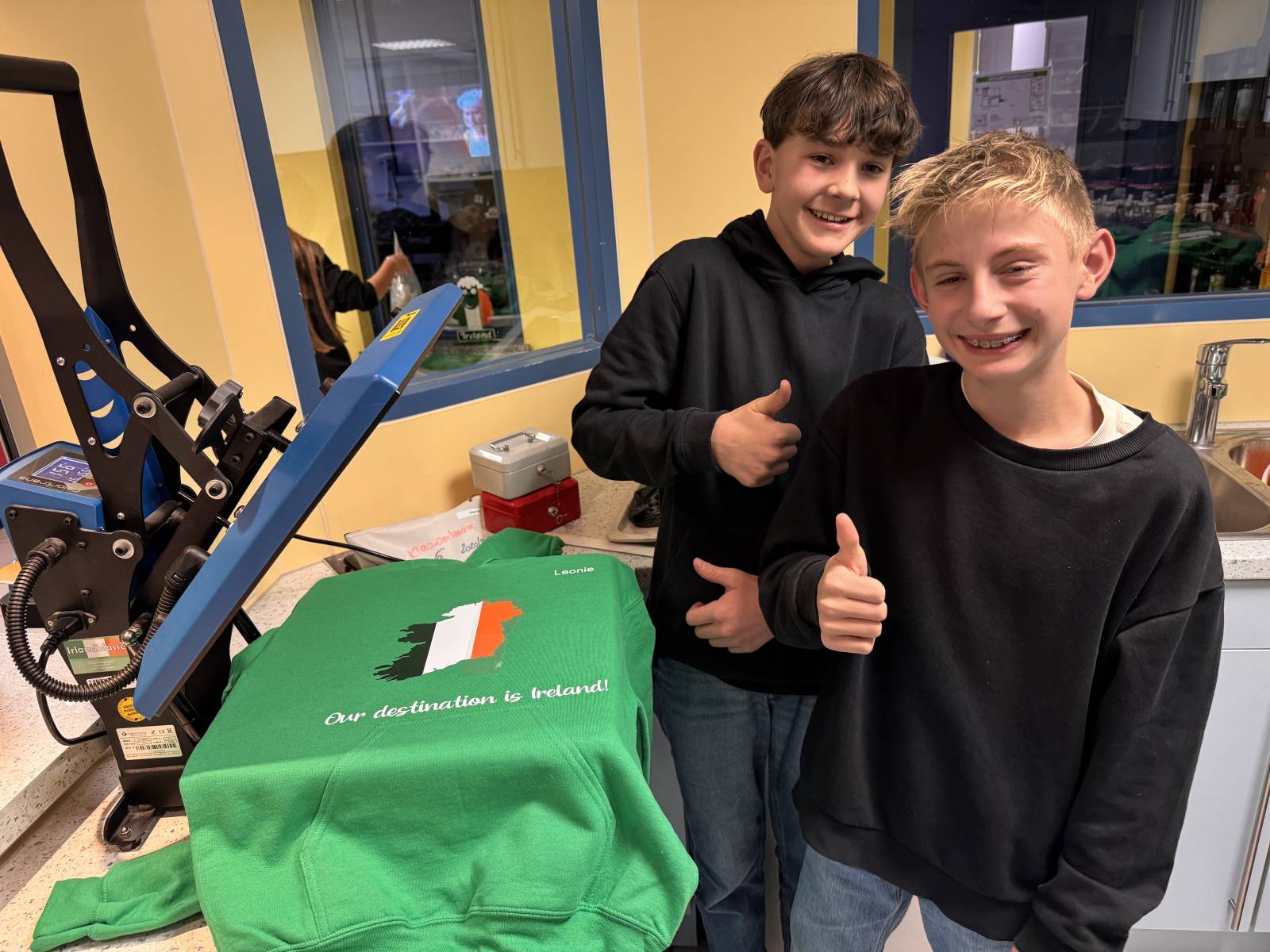 Im November legten die Schülerinnen und Schüler der Irlandklasse dann mit der Produktion ihrer Outfits los. Im Rahmen der „Plotter-Stunden“ werden seither die drei verschiedenfarbigen Teile der Flagge, das Schullogo, die Namen der Schülerinnen und Schüler, der Spruch, die Klassenlisten und das Logo des Schirmherrn der Irlandklasse (MS-Schramberg) im PC-Programm angelegt, durch den Plotter gedruckt bzw. geschnitten, anschließend von Hand entgittert und dann mit Hilfe der Presse und Wärmeübertragung auf die Hoodies und T-Shirts gepresst.