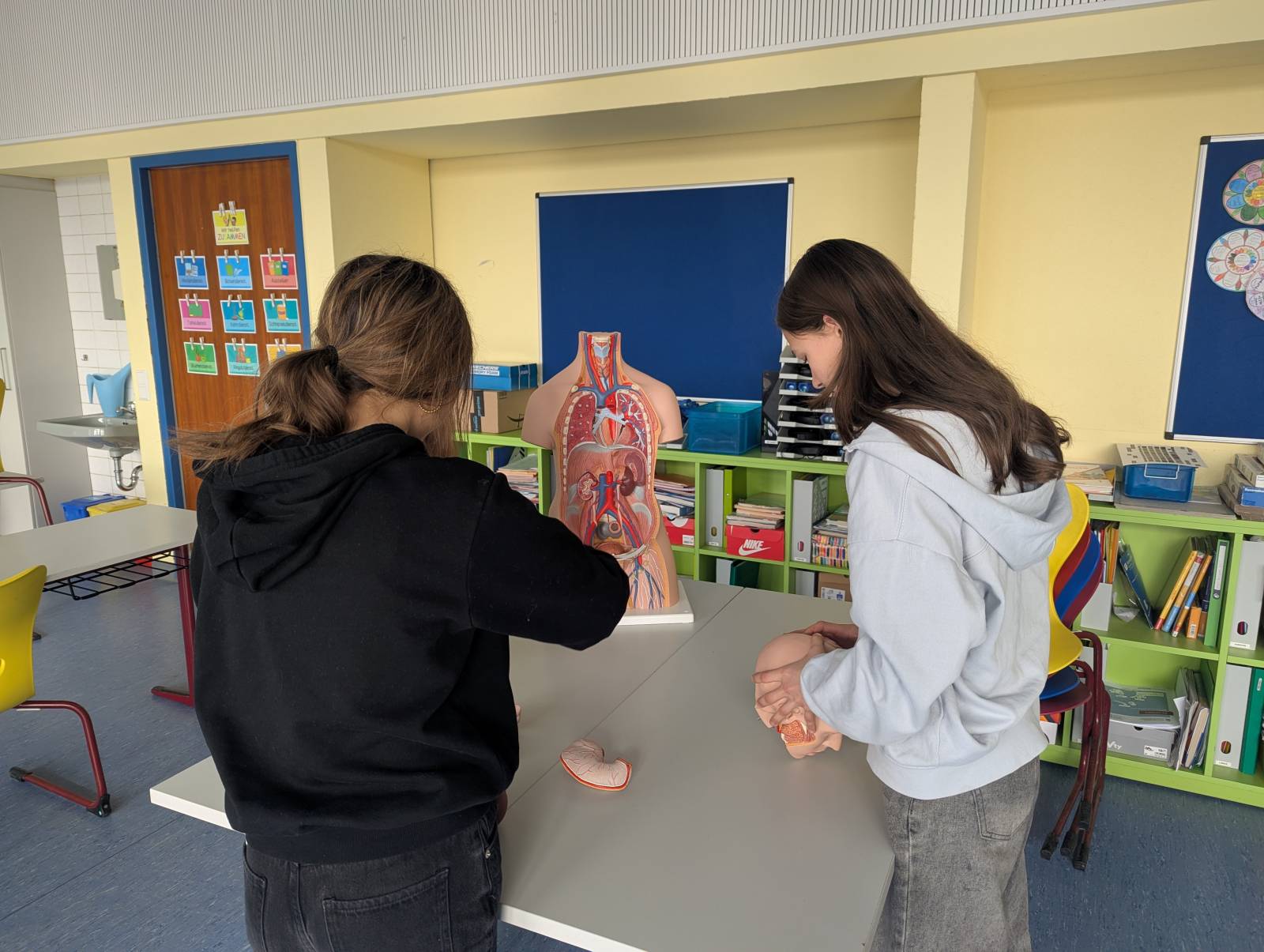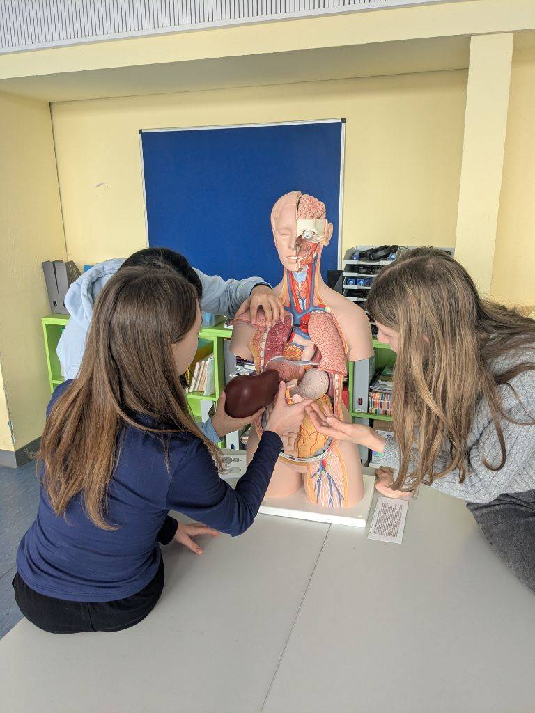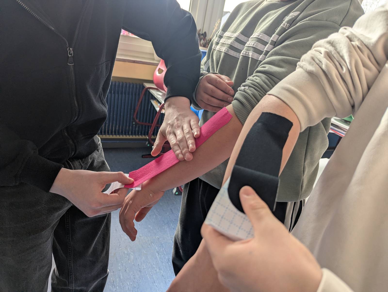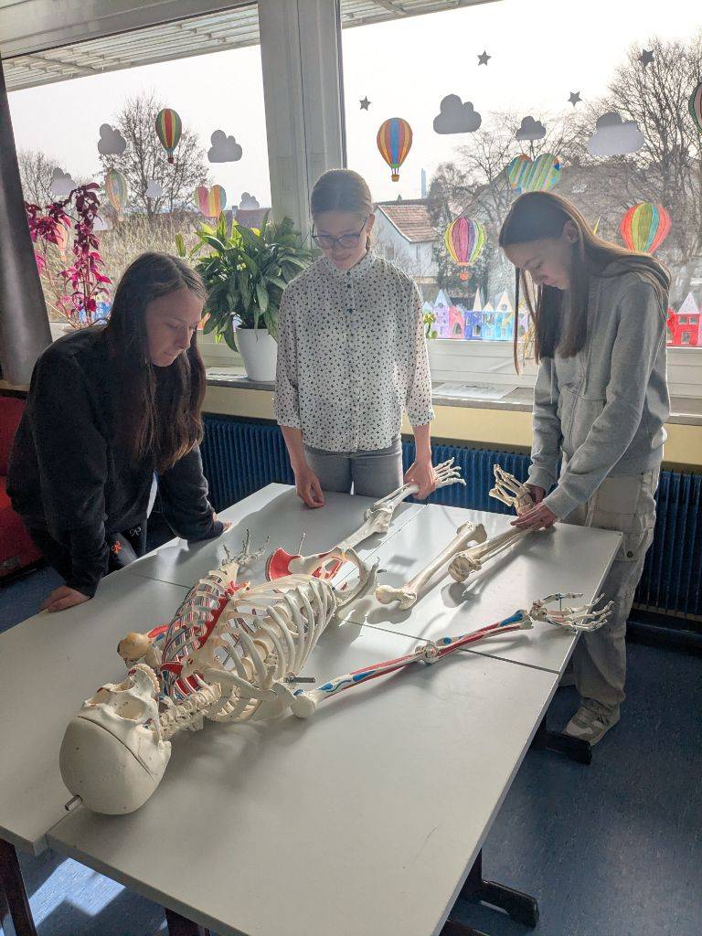 Bei der Physiotherapeutin erkundeten die Achtklässlerinnen und Achtklässler die verschiedenen Organe und Knochen eines Menschen und durften sich gegenseitig unter Anleitung von Frau Broghammer ein Tape anbringen.