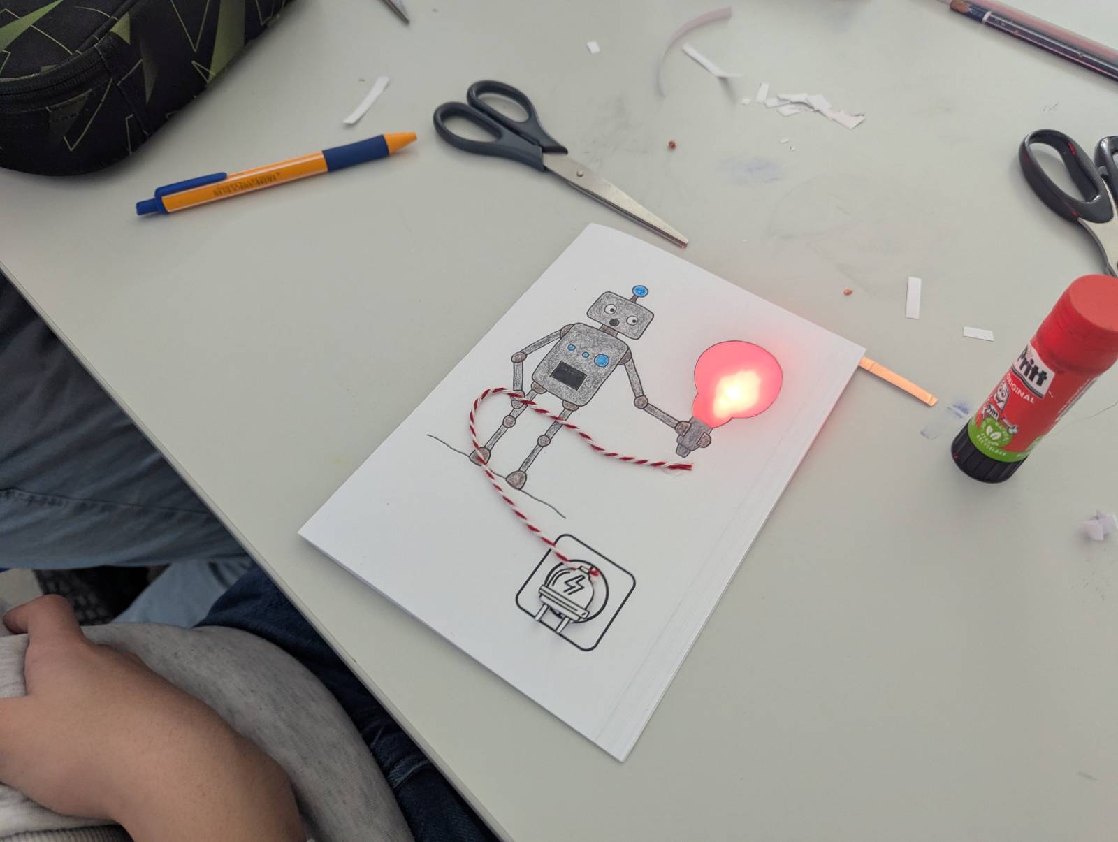 Beim Elektriker durften die Jugendlichen einen Stromkreis mit einer LED selbst bauen und sich dabei im Umgang mit Elektrizität üben.