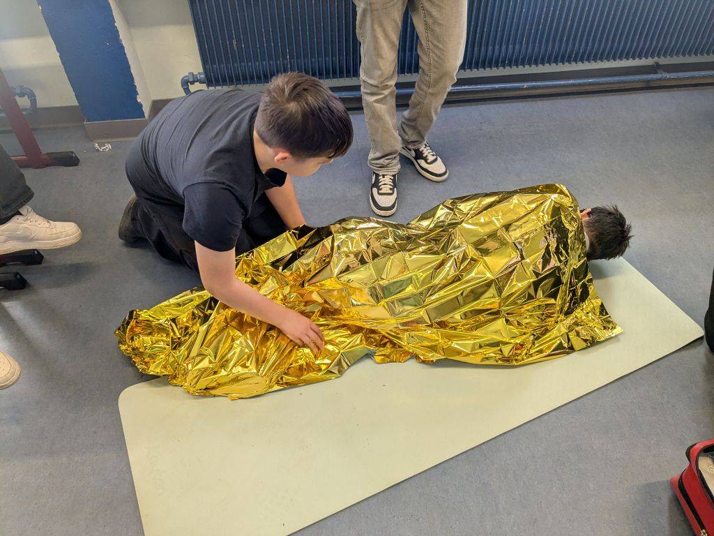 Beim Notfallsanitäter wurde die stabile Seitenlage geübt und besprochen, welchen Zweck eine Wärmedecke bei einem Unfall hat und wie diese ordnungsgemäß am Patienten angebracht werden muss.