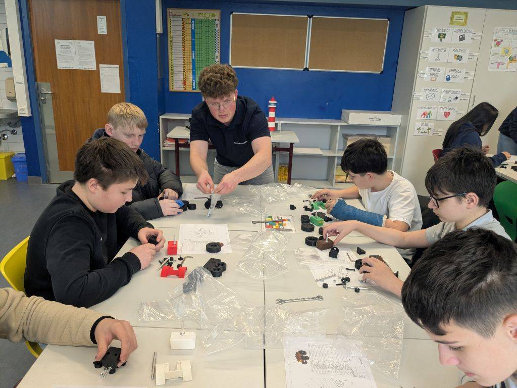 Anschließend gingen die Schülerinnen und Schüler ins aktive Tun über. Sie durften einen Miniatur-Traktor aus Aluminium und Kunststoff, der im 3D-Drucker gedruckt und von Auszubildenden entworfen wurde, mit Hilfe eines Bauplans zusammenbauen und die verschiedenen Bauteile montieren. Unterstützt wurden die Jugendlichen hierbei von zwei Ausbildern und fünf Auszubildenden der Firma KERN LIEBERS.