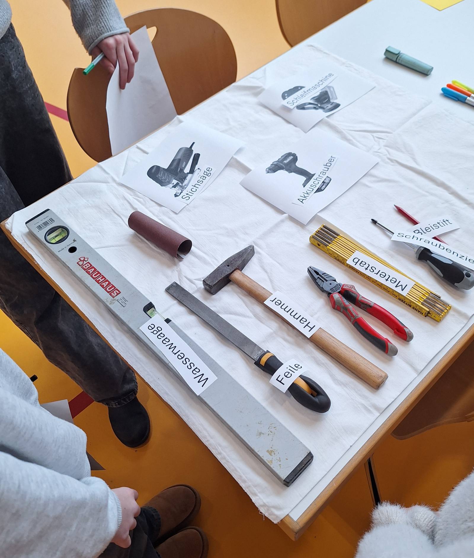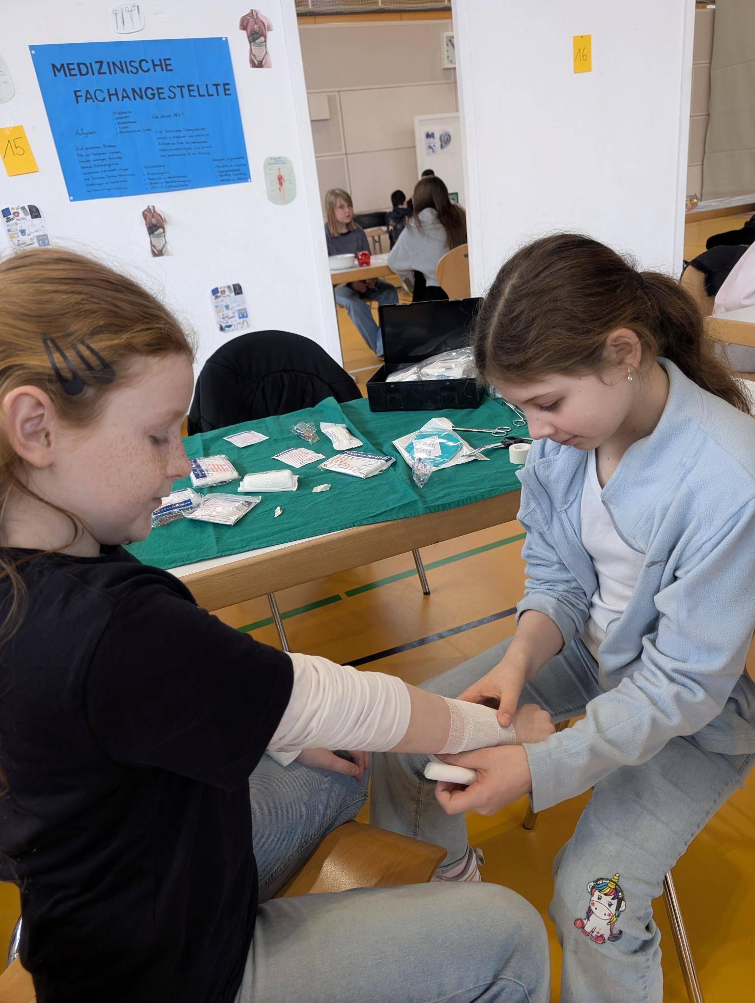 An selbstständig vorbereiteten und entsprechend gestalteten Ständen stellten sie die Tätigkeiten anschaulich vor und ermöglichten somit den Schülerinnen und Schülern der Klassen 4, 5 und 6 Einblicke in die verschiedenen Tätigkeiten. Hierbei wurde nicht nur Theorie, sondern auch Praxis vermittelt. So durften die Kinder beispielsweise erleben, wie Verbände angelegt oder Locken gewickelt werden, aber auch wie in sozialen Berufen mit Menschen gearbeitet wird.
