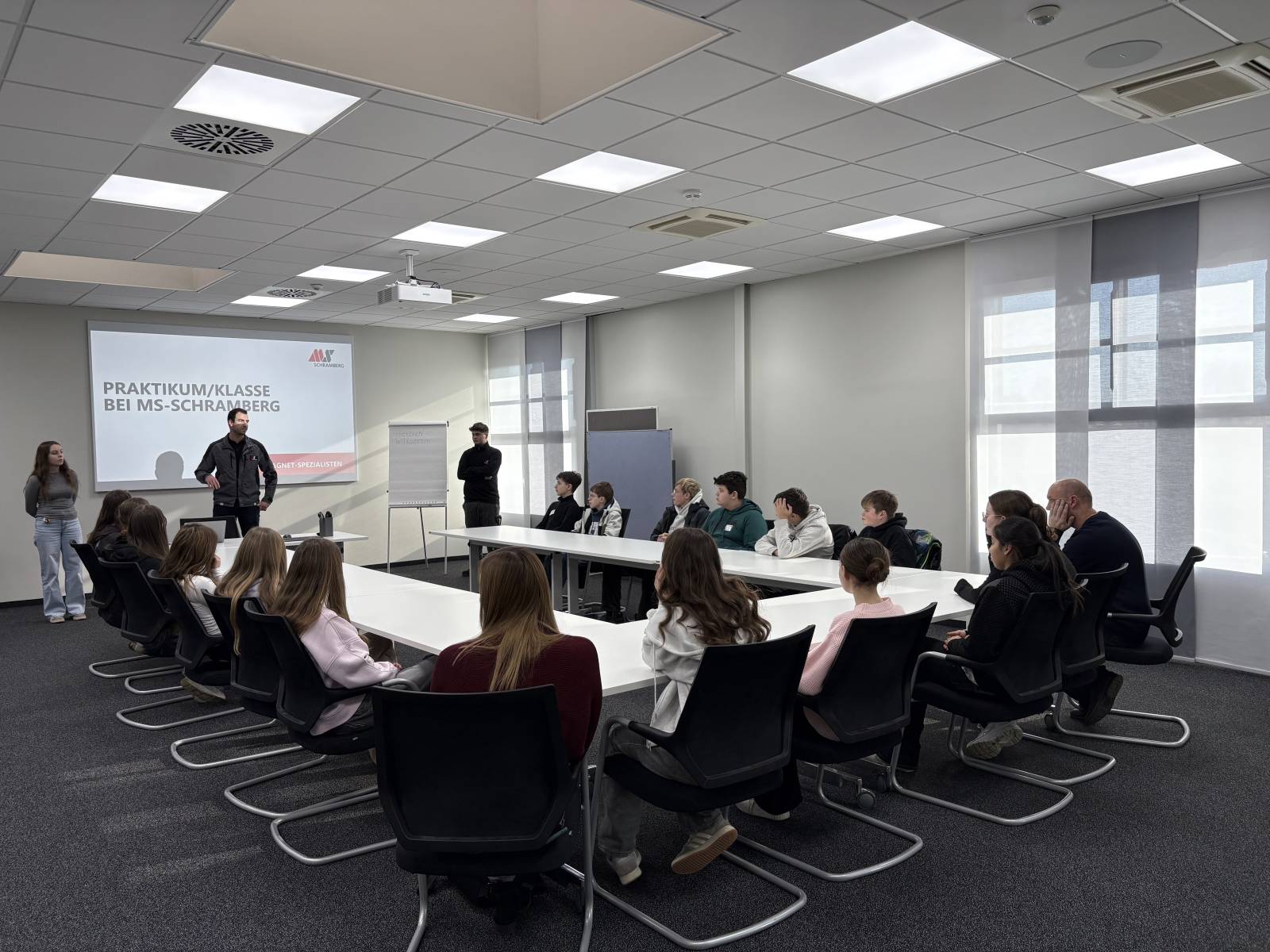 Zu Beginn wurden die Jugendlichen von aktuellen Auszubildenden herzlich empfangen. In einer anschaulichen Firmenpräsentation stellten diese das Unternehmen vor und erklärten unter anderem, wie Magnete hergestellt werden. Außerdem erhielten die Schülerinnen und Schüler einen Überblick über die vielfältigen Ausbildungsberufe bei MS-Schramberg und die damit verbundenen Perspektiven.
