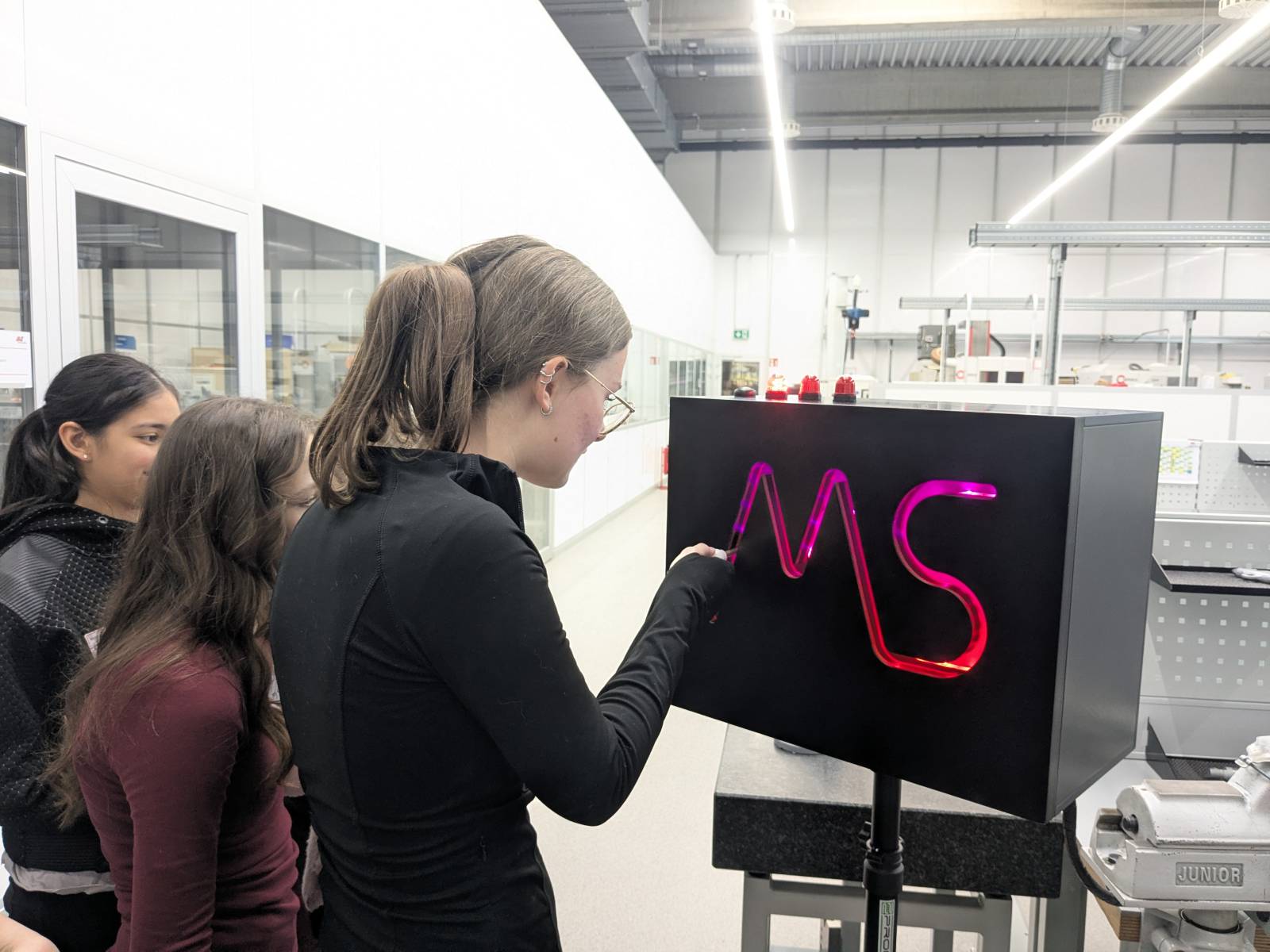 Ein besonderes Highlight des Nachmittags war die anschließende Führung durch die verschiedenen Abteilungen sowie die Lehrwerkstatt, die von Herrn Schneider durchgeführt wurde. Hier konnten die Schülerinnen und Schüler hautnah erleben, wie moderne Arbeitsprozesse aussehen und welche Technik dabei zum Einsatz kommt. Auch praktisches Ausprobieren kam nicht zu kurz: Beim Geschicklichkeitsspiel „Heißer Draht“ war Konzentration und eine ruhige Hand gefragt.