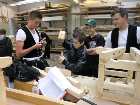 Dabei bewegten wir uns durch modernste Ausbildungshallen. Meister wie Auszubildende nahmen sich viel Zeit, um uns die verschiedenen Arbeitsvorgänge, Werkzeuge und Maschinen zu erklären. Da man in der Regel auch alles gleich ausprobieren durfte, verging die Zeit wie im Fluge. Wir „schnupperten“ uns durch folgende Berufsbilder: Maurer, Schreiner, Stuckateur, Konditor und Friseur.