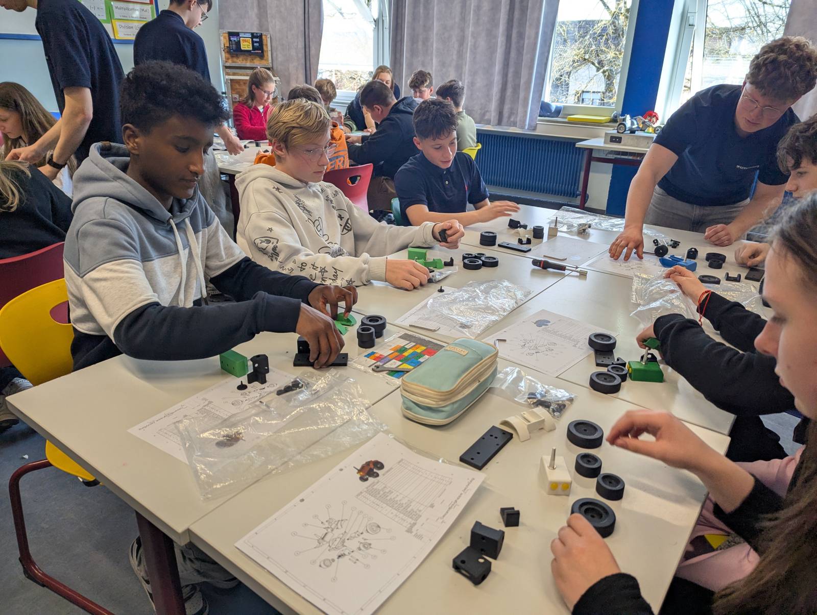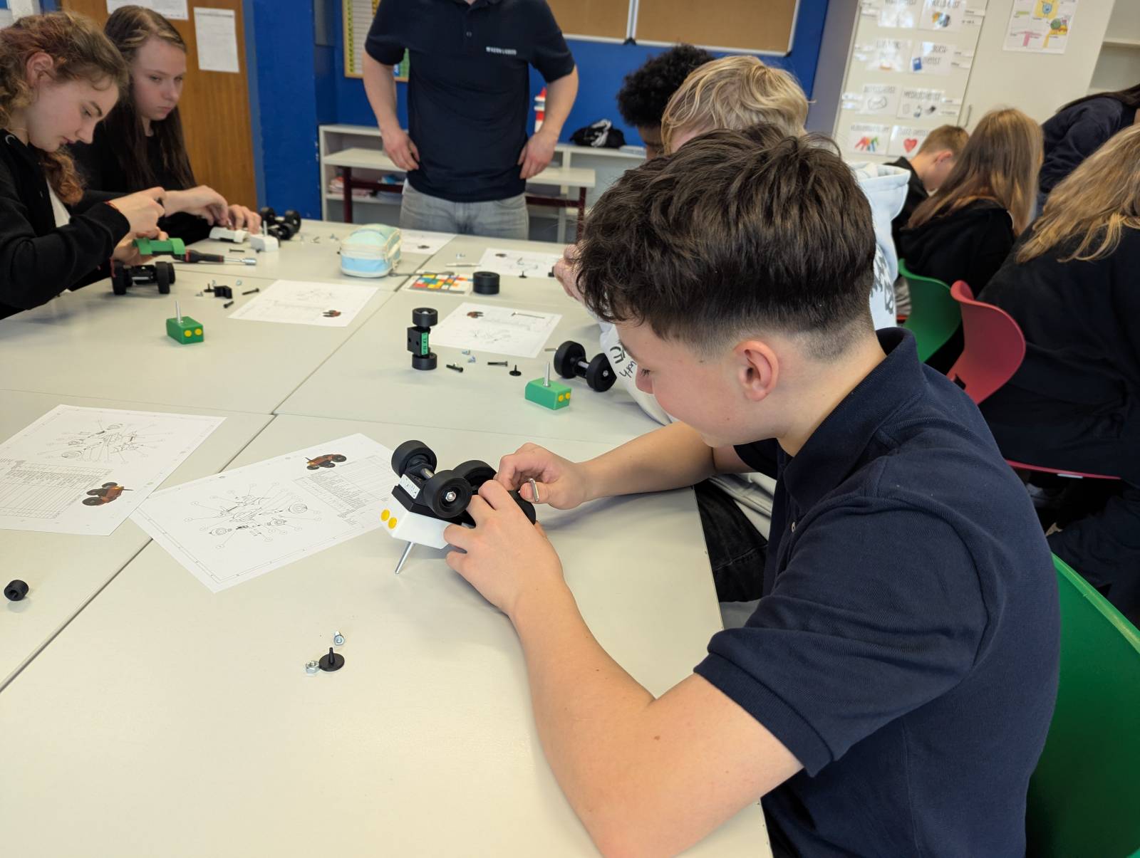 Anschließend gingen die Schülerinnen und Schüler ins aktive Tun über. Sie durften einen Miniatur-Traktor aus Aluminium und Kunststoff, der im 3D-Drucker gedruckt und von Auszubildenden entworfen wurde, mit Hilfe eines Bauplans zusammenbauen und die verschiedenen Bauteile montieren. Unterstützt wurden die Jugendlichen hierbei von zwei Ausbildern und fünf Auszubildenden der Firma KERN LIEBERS.