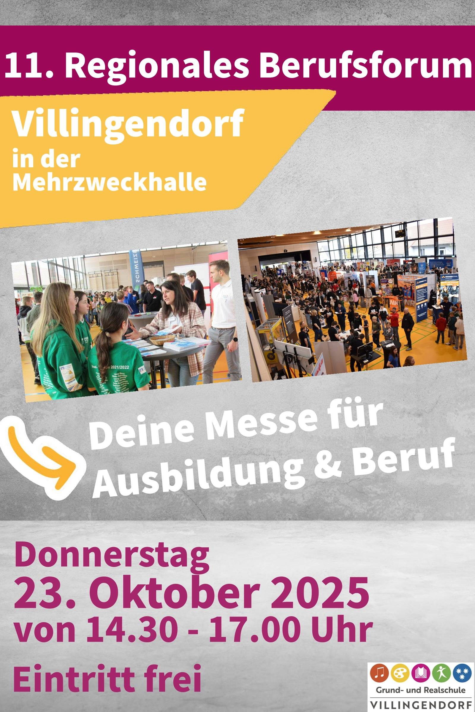 Der Übergang in die Arbeitswelt stellt eine Herausforderung dar. Das elfte Regionale Berufsforum bietet am 23. Oktober 2025 von 14.30 Uhr bis 17.00 Uhr die Möglichkeit für unmittelbare Begegnungen. Ort ist die Mehrzweckhalle in Villingendorf. Ob Praktikum, Berufsausbildung oder das unmittelbare Kennenlernen von Unternehmen und Institutionen – Azubis und Mitarbeiter freuen sich auf alle interessierten Besucher.