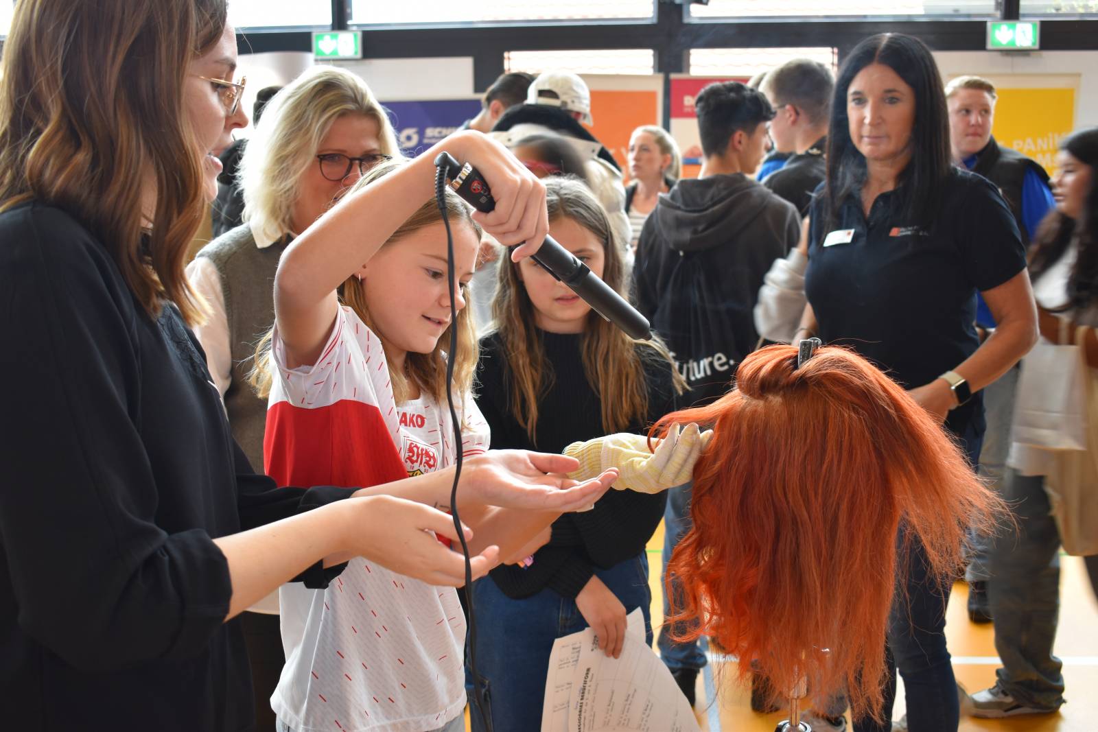 Vor dem Eingangsbereich präsentiert sich die freiwillige Feuerwehr Villingendorf mit Einsatzwagen und Löschgerätschaften – natürlich handlungsorientiert und zum Ausprobieren. Denn auch das ehrenamtliche Engagement kann für die berufliche Karriere förderlich sein und ist in unserer Gesellschaft unverzichtbar.