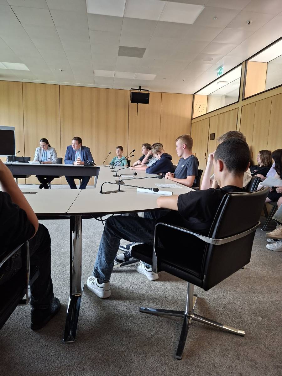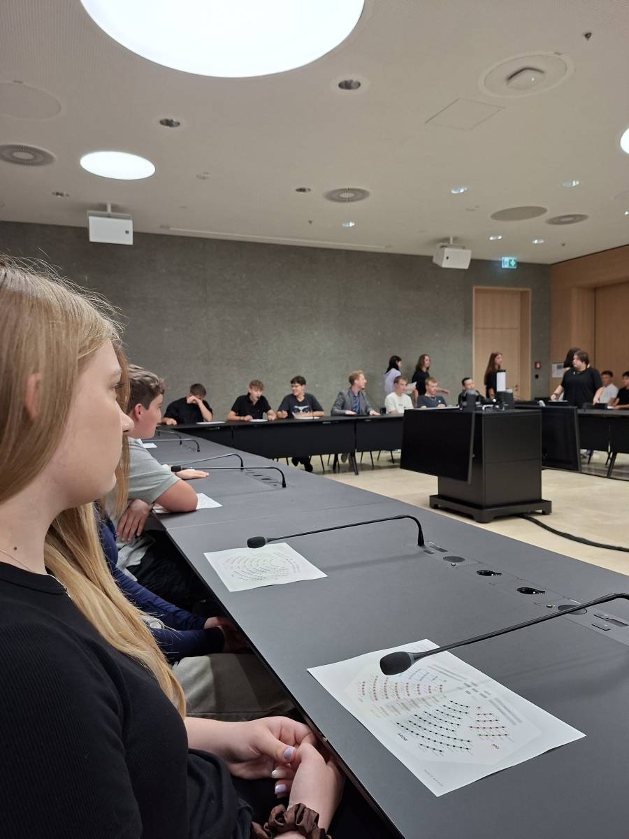 Im Anschluss trafen die Jugendlichen auf den Abgeordneten Niklas Nüssle (Bündnis 90/Die Grünen). Im folgenden Austausch, dessen Inhalte durch die Fragen der SuS bestimmt wurden, ging es um Elektromobilität, Windräder, Klimaschutzvorgaben beim Bauen, die Auswirkungen des Krieges in der Ukraine (Sanktionen), die Panne im Kultusministerium (1400 vakante aber als besetzt geführte Lehrerstellen), die Abwicklung der meisten Werkrealschulen (Wegfall des Werkrealschulabschlusses), die unbefriedigende technische Ausstattung an vielen Schulen, das neu eingeführte Unterrichtsfach „Medienbildung“, Abtreibungsregelung rund um den § 218 sowie die Landtagswahl im März 2026. Denn die meisten „Neuner“ sind bis dahin 16 Jahre alt und dürfen am Urnengang teilnehmen – die jüngst beschlossene Wahlrechtsreform macht es möglich.