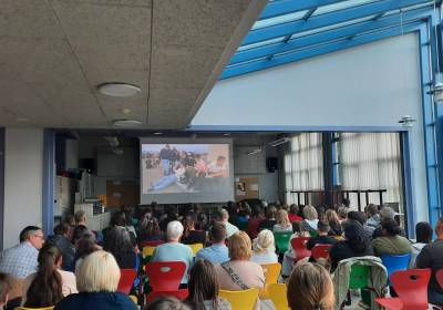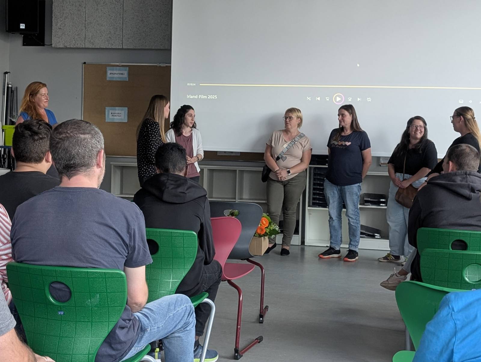 Im Rahmen des irischen Abends konnten die Schülerinnen und Schüler der Irlandklasse nochmals am 29.07.2025 in Erinnerungen an ihre Irlandreise schwelgen. Rund 80 Zuschauer, bestehend aus den Siebtklässlern, deren Eltern, Geschwistern, Großeltern und weiteren Interessierten als auch den Klassenlehrern Lynda Cullen, Kyra Kühnert und Monja Suhm sowie den Begleitlehrern Birgitt Schlieter und Joachim Mauerlechner, bestaunten den von der Lehrerin Monja Suhm erstellten einstündigen Film aus Fotos und Videos von der Reise. Ein tolles Jahr mit vielen wertvollen Erfahrungen und einer genialen Reise geht für die Siebtklässler nun zu Ende und sie können gespannt auf die bevorstehende Kompassklasse im achten Schuljahr blicken.