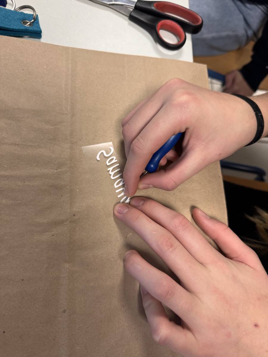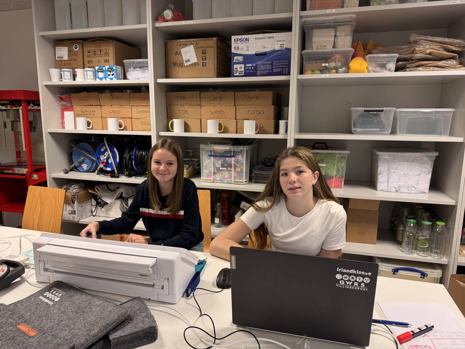 Als sie dann überprüft hatten, ob die Bestellungen aus der Schulgemeinschaft bezahlt wurden, gingen sie an die Produktion. Im Plotter-Programm wurden die Namen eingegeben und mit dem Plotter schließlich gedruckt.