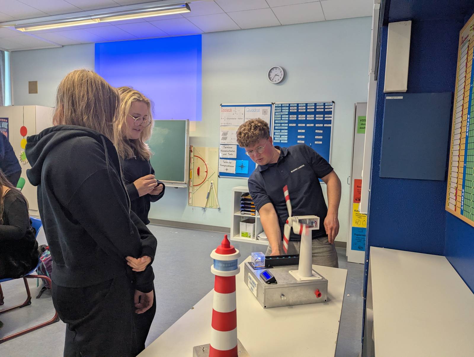 Die Auszubildenden planen und entwerfen im Rahmen ihrer Ausbildung bei KERN LIEBERS verschiedene Projekte bzw. Modelle. Einige dieser Modelle durften die Schülerinnen und Schüler der achten Klasse nach der erfolgreichen Montage ihres eigenen kleinen Traktors bestaunen. Sie erkundeten dabei ein Windrad sowie einen mit LED ausgestatteten Leuchtturm. Außerdem beobachteten sie einen 3D-Drucker, spielten an dem selbstgebauten Flipper-Automaten oder machten mit der VR-Brille einen virtuellen Rundgang durch die Ausbildungsabteilung der Firma.