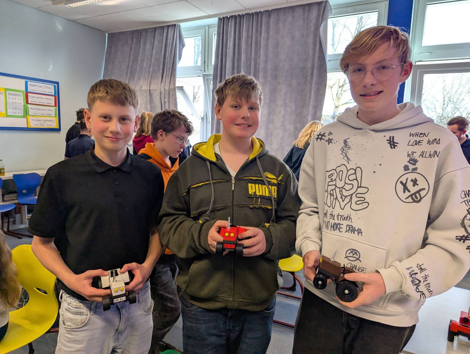 Anschließend gingen die Schülerinnen und Schüler ins aktive Tun über. Sie durften einen Miniatur-Traktor aus Aluminium und Kunststoff, der im 3D-Drucker gedruckt und von Auszubildenden entworfen wurde, mit Hilfe eines Bauplans zusammenbauen und die verschiedenen Bauteile montieren. Unterstützt wurden die Jugendlichen hierbei von zwei Ausbildern und fünf Auszubildenden der Firma KERN LIEBERS.