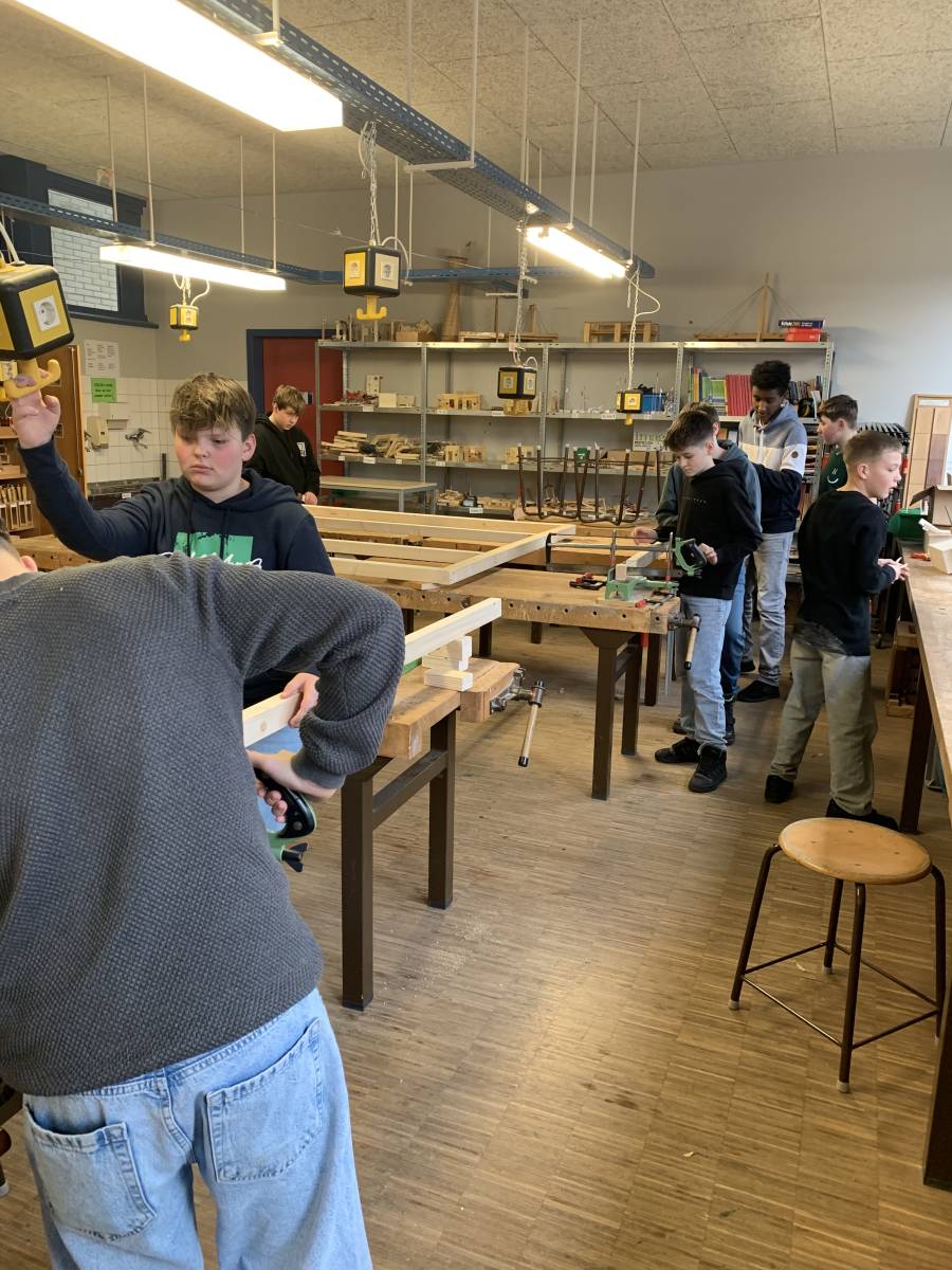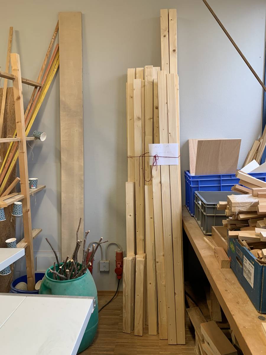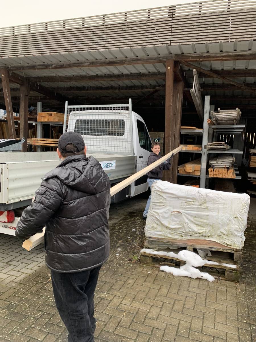 Die Schülerinnen und Schüler des Projekts „Mach was“ sind aktiv beim Herrichten, Ablängen, Transportieren bis hin zum Lagern im Vorbereitungsraum. Mittlerweile sind die Querwände entstanden - dabei waren alle gefordert. Es geht voran!