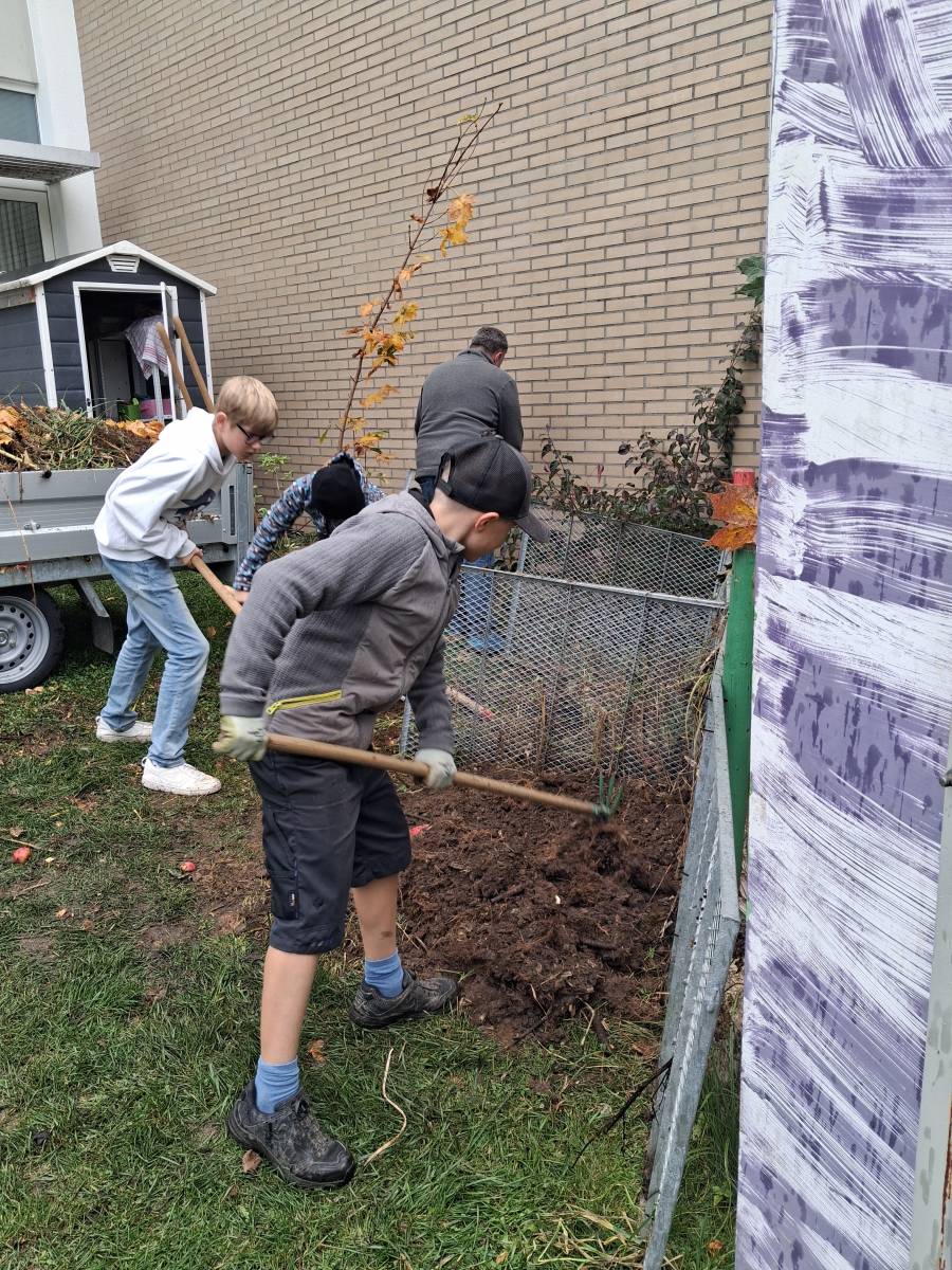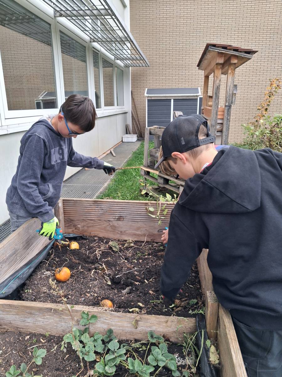 In der Sozialwerkstatt Schulgarten wird bereits tatkräftig mit angepackt und der Kompost versetzt, Pflanzen zurückgeschnitten und der Schulgarten auf den Winter vorbereitet. Mit viel Engagement und teilweise tollen Vorkenntnissen starten die Schülerinnen und Schüler in ein Jahr mit einer „grünen Stunde“ in der Woche. Während der Winterpause heißt es dann z.B. auch, die Schulhausbegrünung indoor etwas aufzupeppen, sich mit Konservierungsmethoden und Verarbeitungsmöglichkeiten der Ernte zu befassen und in der Schulküche direkt praktisch auszuprobieren.